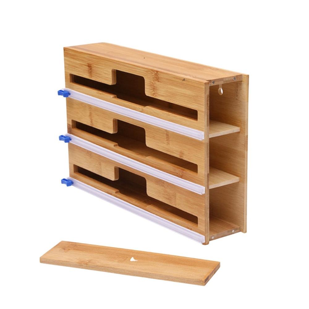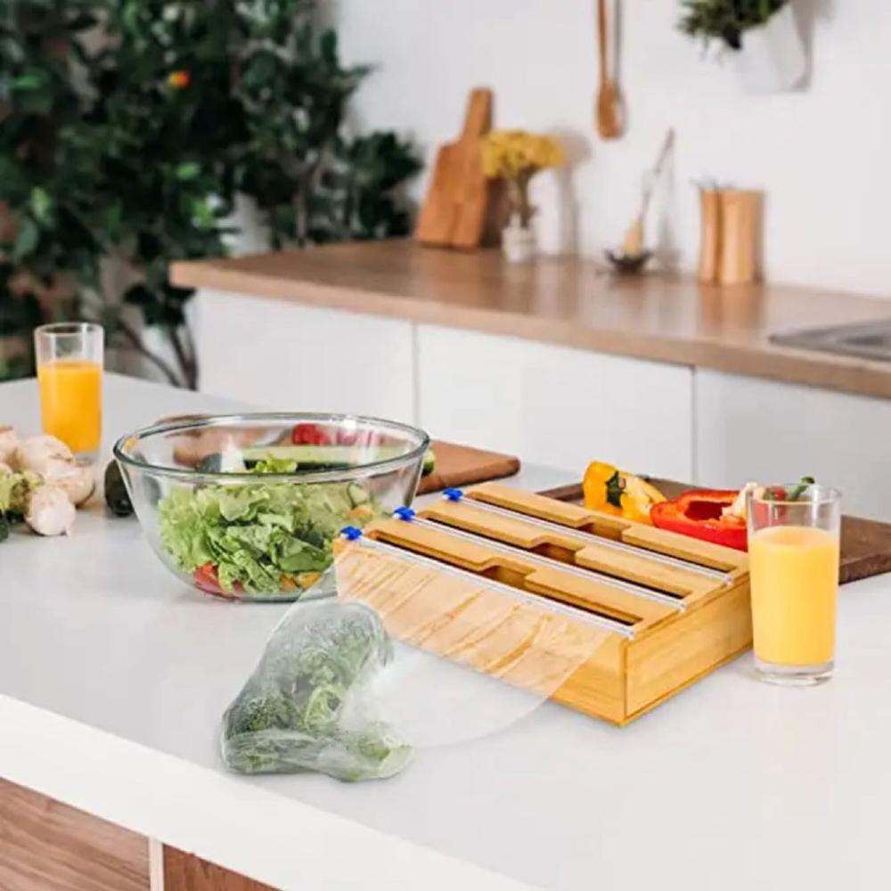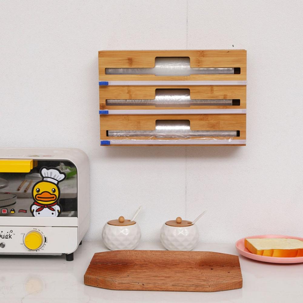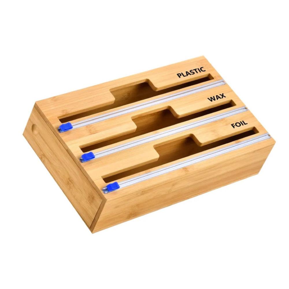 - BOX IT UP, SORT IT OUT, HANG IT UP: Say goodbye to clutter and hello to organization with the 3-in-1 Bamboo Wrap Dispenser. It has three slots for different types of wraps, so you can store and sort them easily and conveniently. You can also mount it on the wall to free up some space and grab your wraps in a snap.