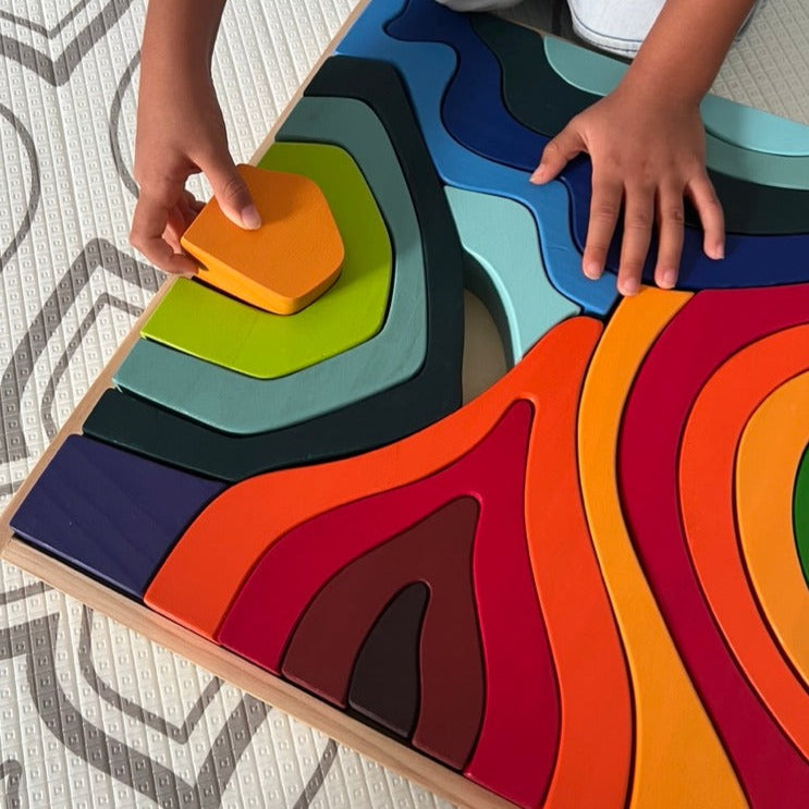 Introduce your child to the world of building with our Abstract Wooden Building Set. With 23 blocks in different sizes and shapes, your child can create endless structures and scenes. This set promotes fine motor skills, color sorting, and strength and grip coordination. Expand the possibilities with our Large Pyramid & Building Block Set.