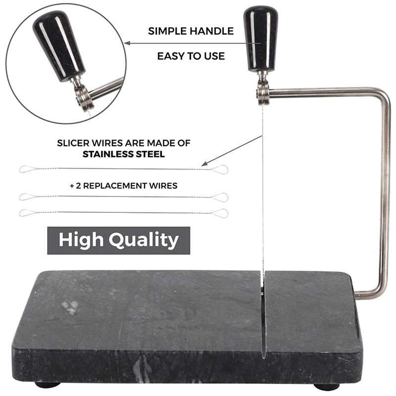 Cut cheese with ease using this stainless steel wire cheese slicer. Providing a neat cut of both soft and hard cheeses, it features an artisan hand-marbled design available in 4 colors. Easy to use and clean, it's the perfect tool for your cheese board.
