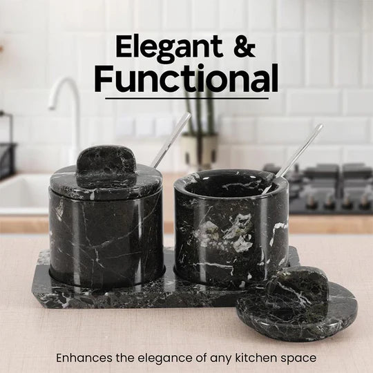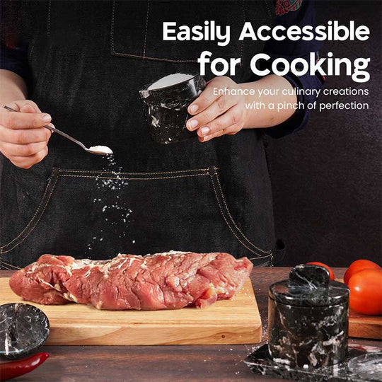 Expertly crafted from natural black marble, this Artisan Marble Salt Cellar and Tray set adds a touch of elegance to your kitchen. The durable design keeps your salt fresh and easily accessible while cooking. Elevate your culinary experience with this stylish and functional piece.