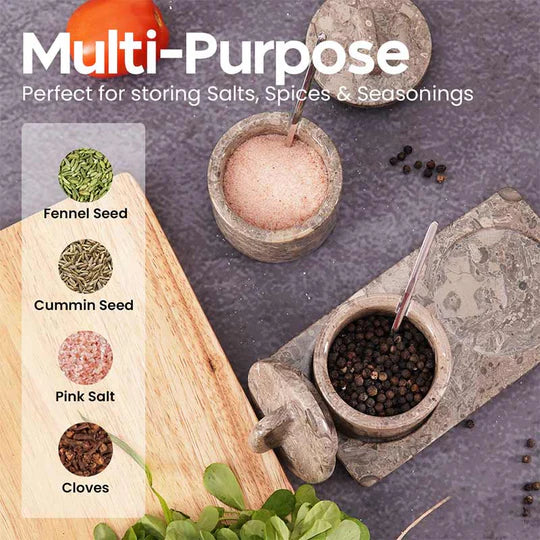 This Artisan Marble Salt Cellar and Tray in light brown is a must-have for any kitchen or dining table. Made from high-quality marble, this elegant set adds a touch of sophistication to your dining experience. Keep your salt within reach while protecting it from moisture with this functional and stylish set.