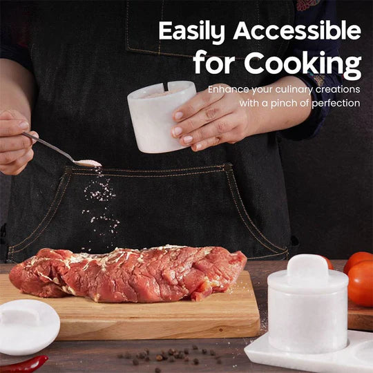 Expertly crafted from natural white marble, this Artisan Marble Salt Cellar and Tray set adds a touch of elegance to your kitchen. The durable design keeps your salt fresh and easily accessible while cooking. Elevate your culinary experience with this stylish and functional piece.