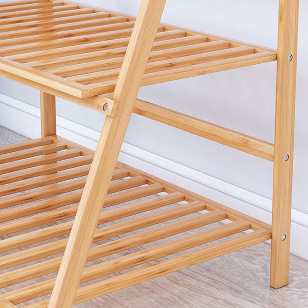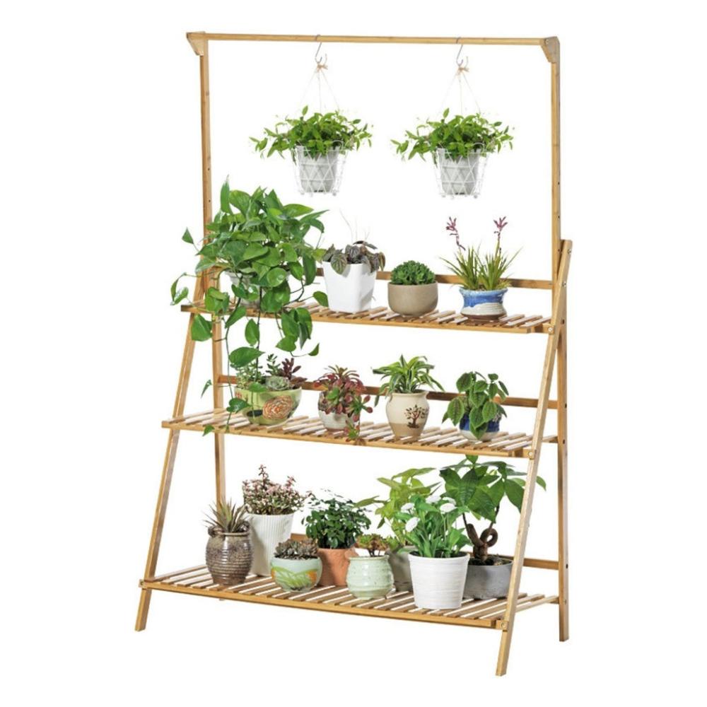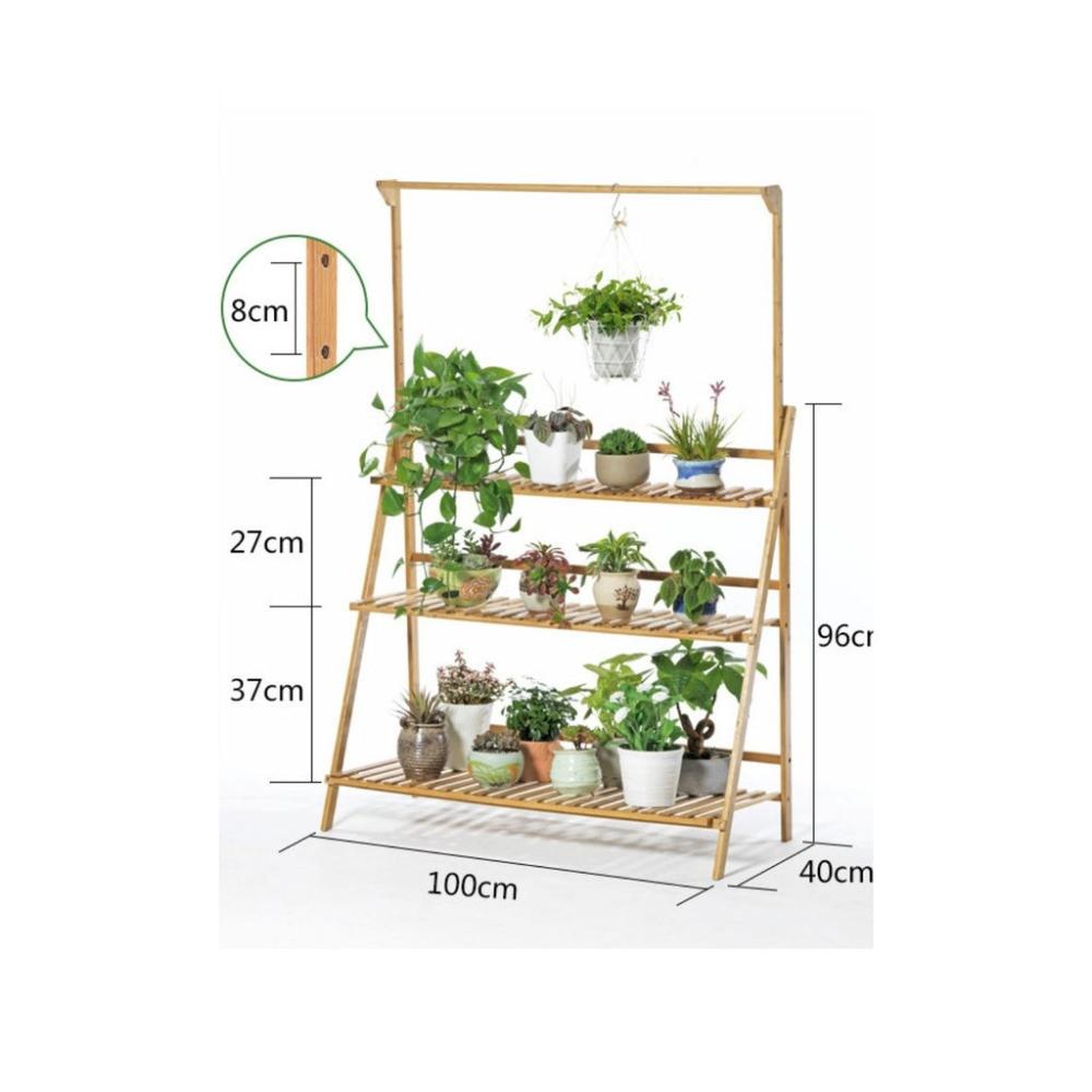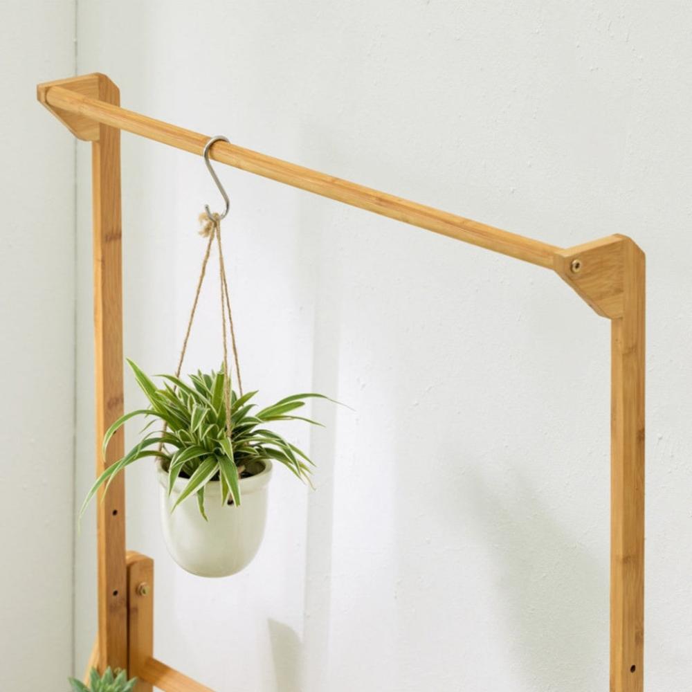 The Bamboo Plant Stand 3 Tier has 3 shelves for displaying plants and a top bamboo rack for hanging plants, making it a stylish and efficient solution for plant enthusiasts.