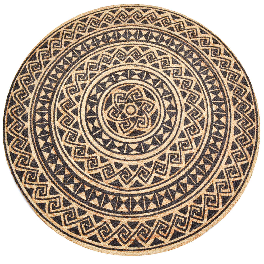 Make a bold statement with this round, hand-woven jute rug! Its natural color with Black floral designs is sure to add a touch of adventure to any space. Create a welcoming atmosphere with this unique, durable rug!