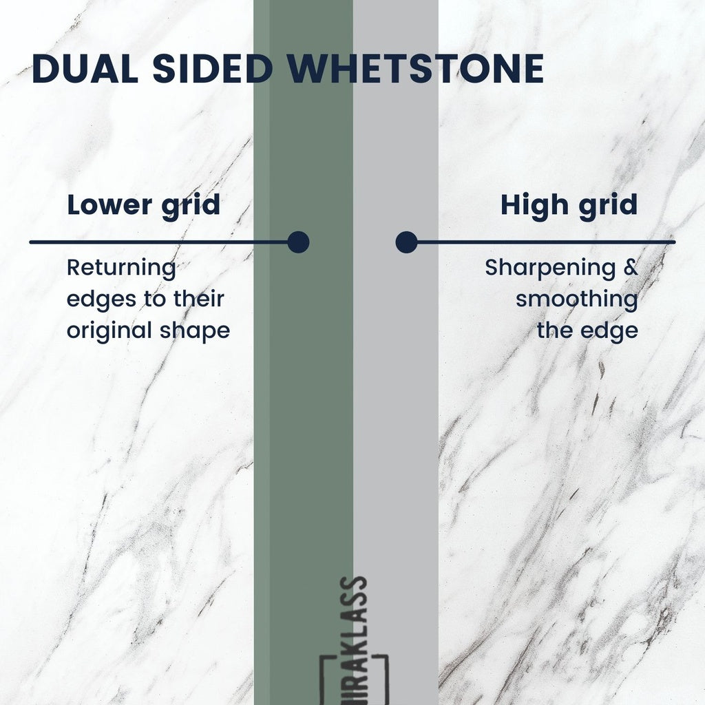 This kit comes with two whetstones ranging from 400/1000 grit and 3000/8000 grit. Lower grit used for bringing edges back to their original shape and higher grit is used for sharpening & smoothing.