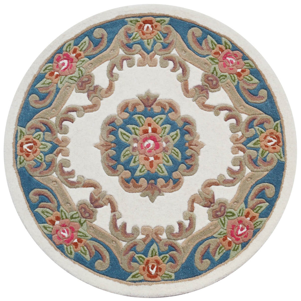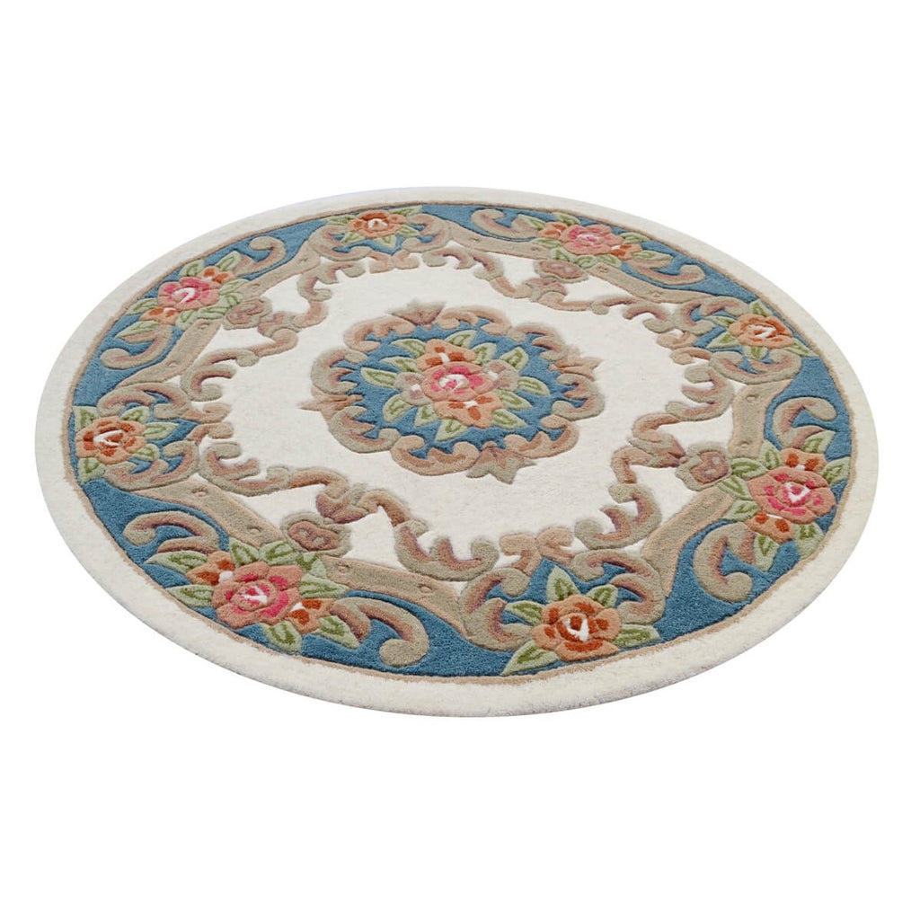 French Floral Handwoven Woolen Rug - Ivory / Blue - Round