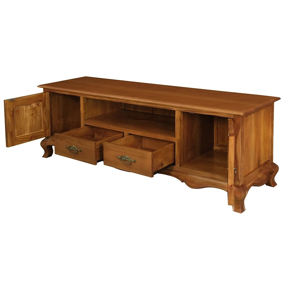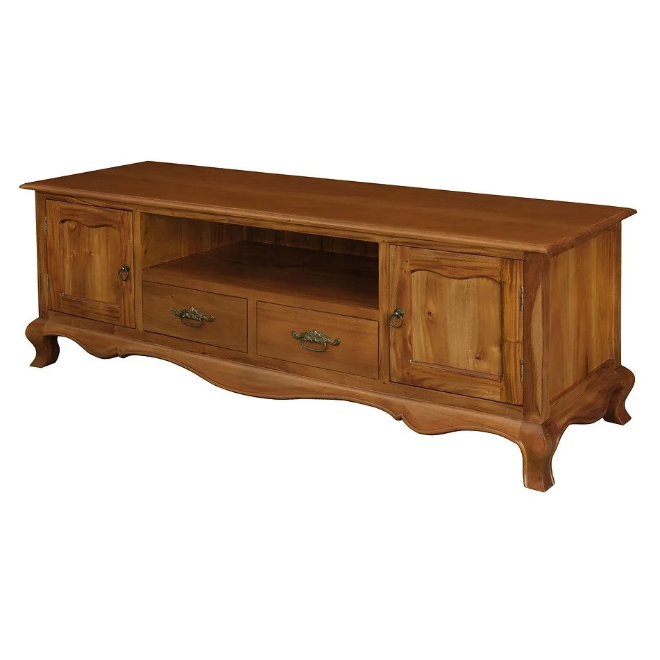 Expertly crafted in a classic French style, these 2 doors 2 drawer entertainment unit offers both style and functionality. With ample storage and a beautiful brown finish, it's the perfect addition to your living room or entertainment space. Accommodates all your media needs while adding a touch of elegance to your home decor.