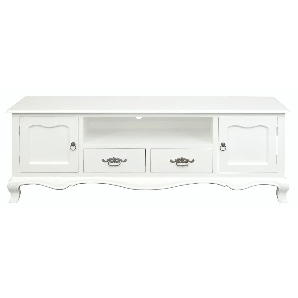 Expertly crafted in a classic French style, this 2 door 2 drawer entertainment unit offers both style and functionality. With ample storage and a beautiful brown finish, it's the perfect addition to your living room or entertainment space. Accommodates all your media needs while adding a touch of elegance to your home decor.