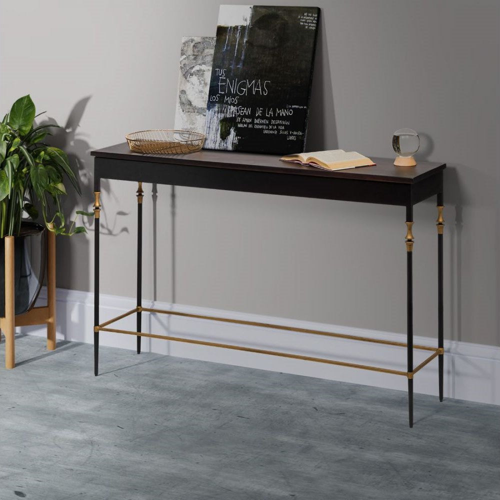 Make a bold statement in your contemporary interior with this exquisite Gold and Black Finial Leg Wooden Top Console Table. With a stunning contrast of finishes, it will instantly amplify the aesthetic of your entryway, hallway or living room. Its luxurious details and strong design make it the perfect centerpiece to proudly display your favorite items.