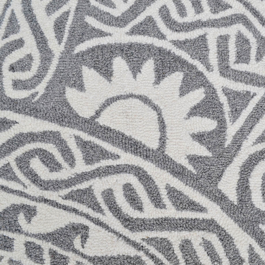 Outfit your space with the natural beauty of this handmade woolen rug. The round grey patch pattern atop a white backdrop add a stunning splash of texture as you take on life's adventures! Make a bold statement with this timeless piece.