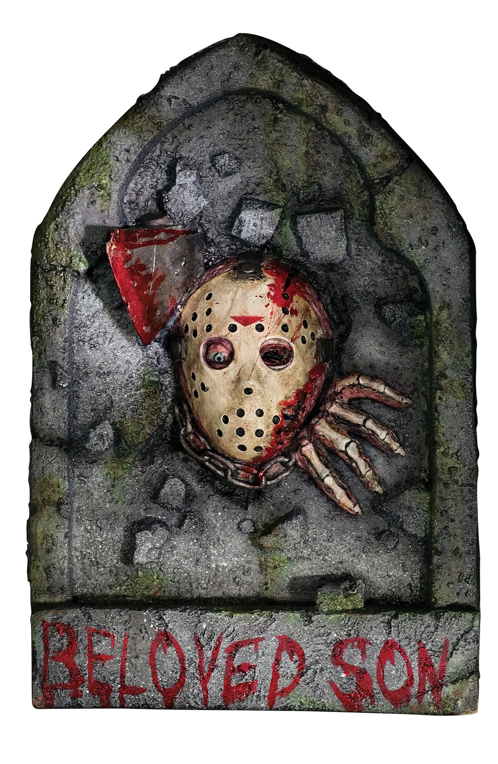 Transform your home into a spooky graveyard with the Friday The 13th Movie Jason Tombstone. The 90cm tall moulded foam tombstone features intricately painted details, including Jason's iconic mask and creepy writing. Measuring 60cm wide, it's the perfect addition to your Halloween decor.