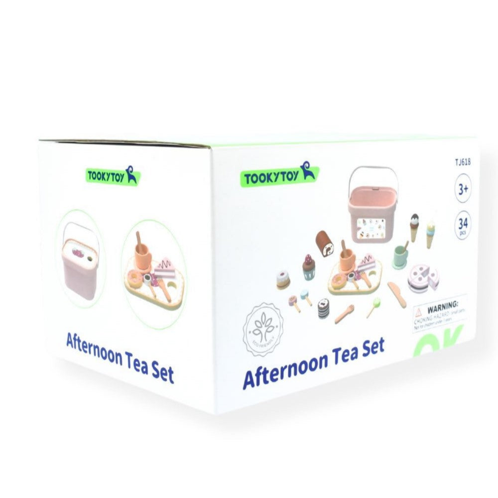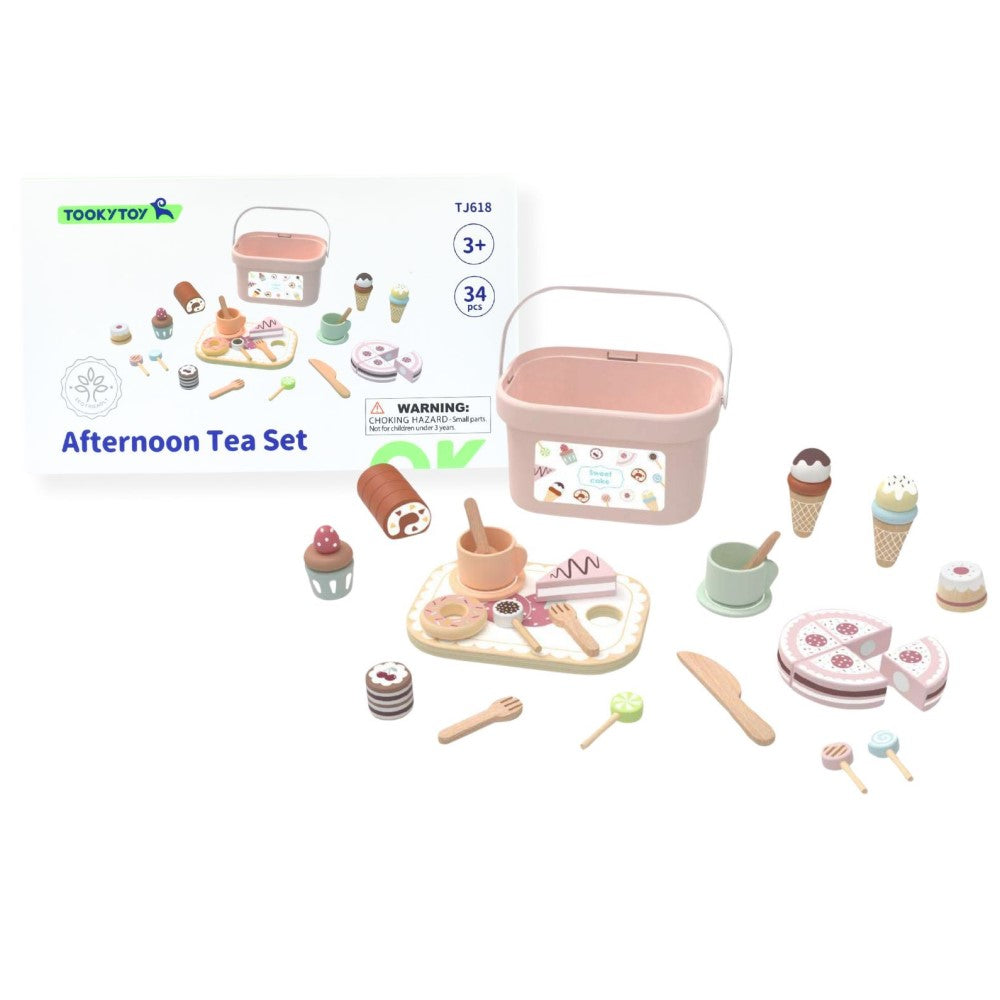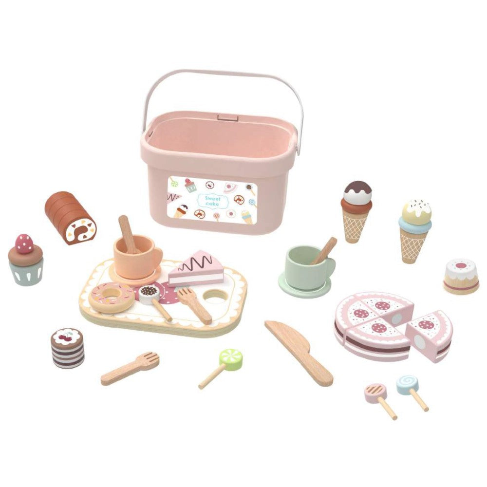 Encourage creativity and social interaction with the Kids Afternoon Tea Playset In a Bucket. Made with durable Juniper wood and plywood, this pastel-colored playset includes cakes, tray, cups, and saucers for a realistic tea time experience. The included pink plastic bucket makes cleanup and storage a breeze.