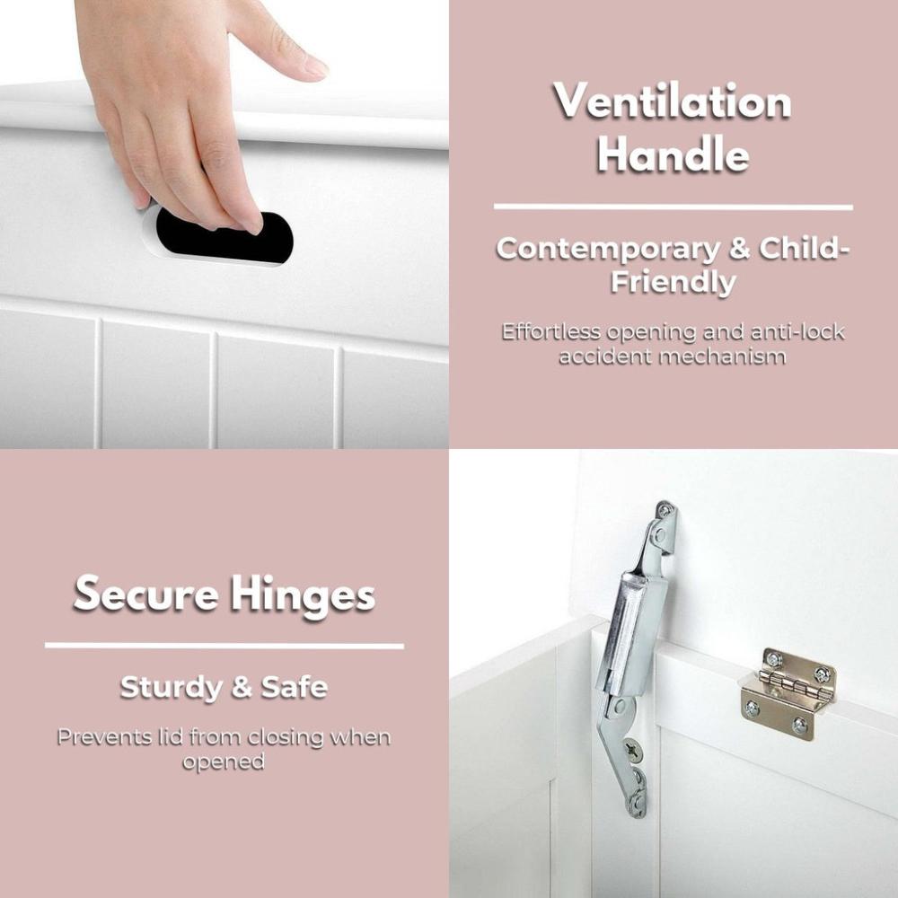 Crafted with a child's safety in mind. This storage box features an air gap handle for a modern aesthetic while preventing children from getting trapped inside. Additionally, the durable closing hinges are designed to keep the lid open without any accidental closures.