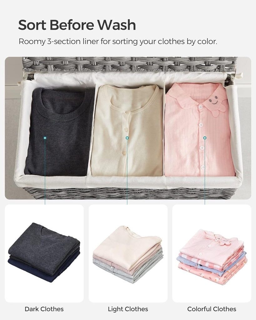 3-Section Laundry Basket with Lid: The lid can be easily opened with one hand and helps to contain unpleasant odors and keep dust out. The 3 separate sections allow you to pre-sort your laundry into darks, lights, and colored clothing for easy washing