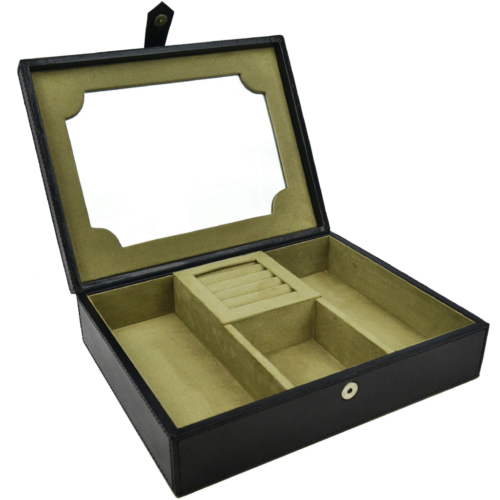 Discover a world of hidden treasures with this Leather Jewelry Box. With four stunning colors to choose from, the spacious storage capacity and easy-access rings slot make this the perfect vessel for all your most precious gems. It features a button lock. Flip open the lid to reveal the handy mirror, and elevate your style to the next level. Get ready for an adventure!