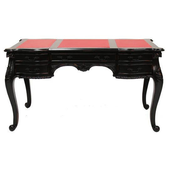 The Leather Top 5 Drawers Paris Office Desk combines classic Louis Paris style with modern functionality. Its rich carving, decorative legs, and antique brass hardware exude luxury. The user's side features five drawers while the back has false drawers, providing ample storage. The black finish pairs beautifully with marine-blue Italian leather for a sophisticated touch.