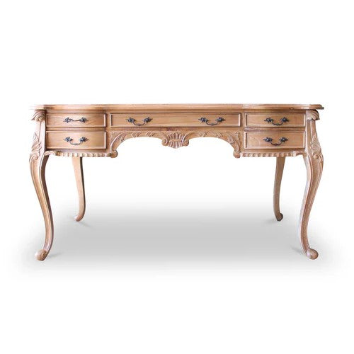 The Leather Top 5 Drawers Paris Office Desk combines classic Louis Paris style with modern functionality. Its rich carving, decorative legs, and antique brass hardware exude luxury. The user's side features five drawers while the back has false drawers, providing ample storage. The weathered oak finish pairs beautifully with marine-blue Italian leather for a sophisticated touch.