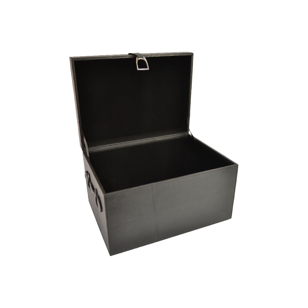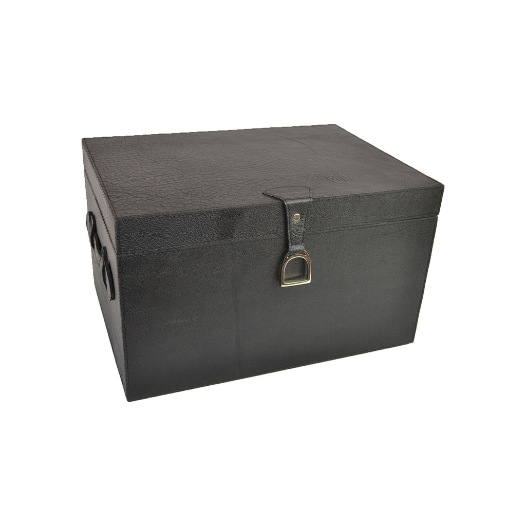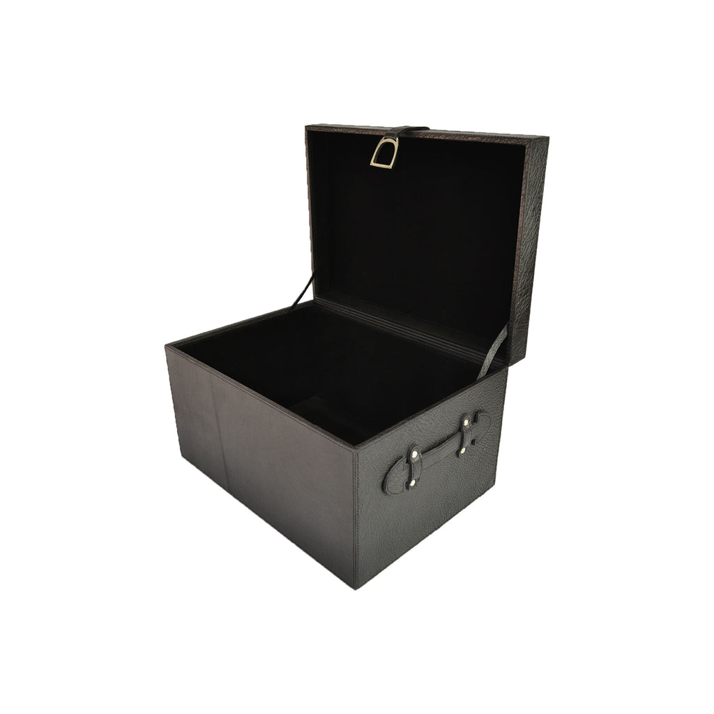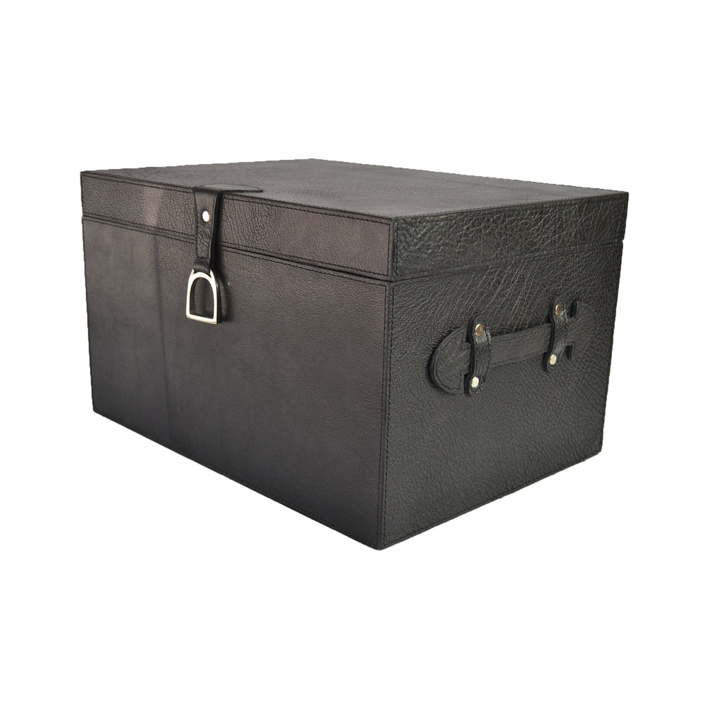 Be fearless with this Leather Trunk Box With Stirrup - Black! This stylish and durable box features a rectangle design, leather handles for easy lifting, and an ornate brass stirrup that adds an adventure-ready touch. Take on the world with confidence!