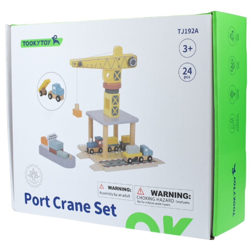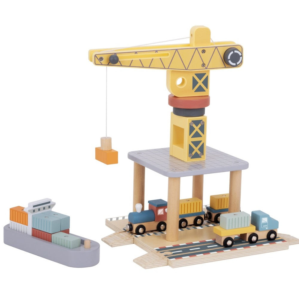 Experience the bustling world of a harbor with the Lift and Load Port Crane Cargo Set. Made with eco-friendly wooden components, this comprehensive set includes a crane, train, truck, track, ship, and shipping containers. Perfect for developing hand-eye coordination and problem-solving skills.