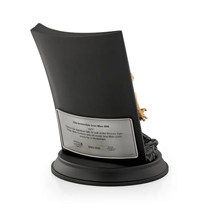 As an industry expert, witness Tony Stark's iconic Bronze Age MK IV suit, damaged in battle with Ultimo. This limited edition, designed by Alan Quah and Ghim Ong, features a 24K gilded pewter Iron Man in his iconic pose, against original 1977 cover art. A must-have for any retro Iron Man fan.