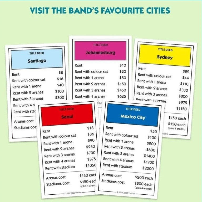 Travel the world with the iconic band Metallica in Monopoly - Metallica World Tour Edition. Collect cities, arenas, and stadiums to increase your value. Land on "Carpe Diem" or "Shortest Straw" for exclusive rewards or face parking and stage repair fees. An exciting twist on the classic game, perfect for fans of the band.