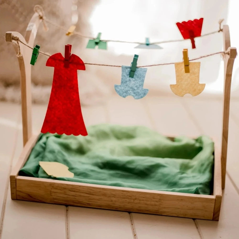 Enhance your child's motor skills and independence with our Montessori Clothes Hanging Play Set. This play set promotes hand-eye coordination and teaches the basics of self-care in a fun and educational way. Made with durable and child-safe materials for hours of imaginative play.