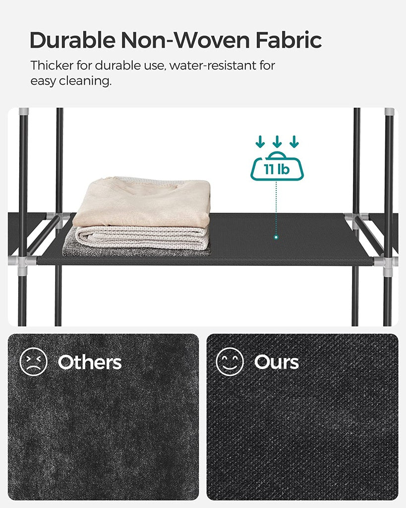 Great Strength: This portable wardrobe is made of 16 mm thick metal pipes, quality plastic connectors, and 120 g/㎡ non-woven fabric. The hanging rail can support 15 kg, and each shelf can hold up to 5 kg