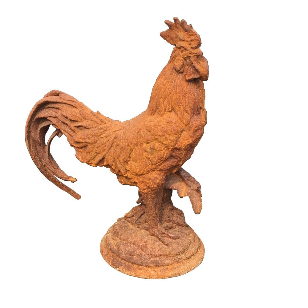 Experience adventure with this rustic Outdoor Cast Iron Rooster Garden Statue! Crafted with intricate details, this rooster stands tall on a round base, inviting you to take a risk and explore the great outdoors. Step out of your comfort zone and embark on a daring journey!