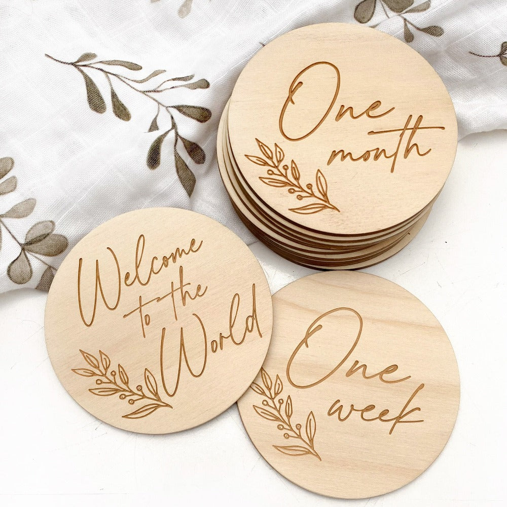 Age Milestones (14 plaques) - monthly age plaques plus additional 'Hello I'm New Here' and one week old. Perfect without personalisation to order before babe is born or as a special baby shower gift. Personalise if you know babe's name beforehand and capture that newborn goodness from day one.