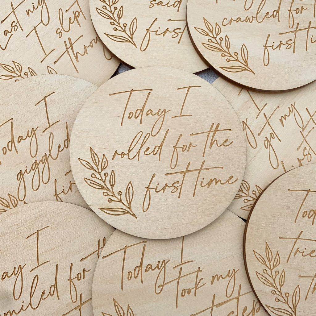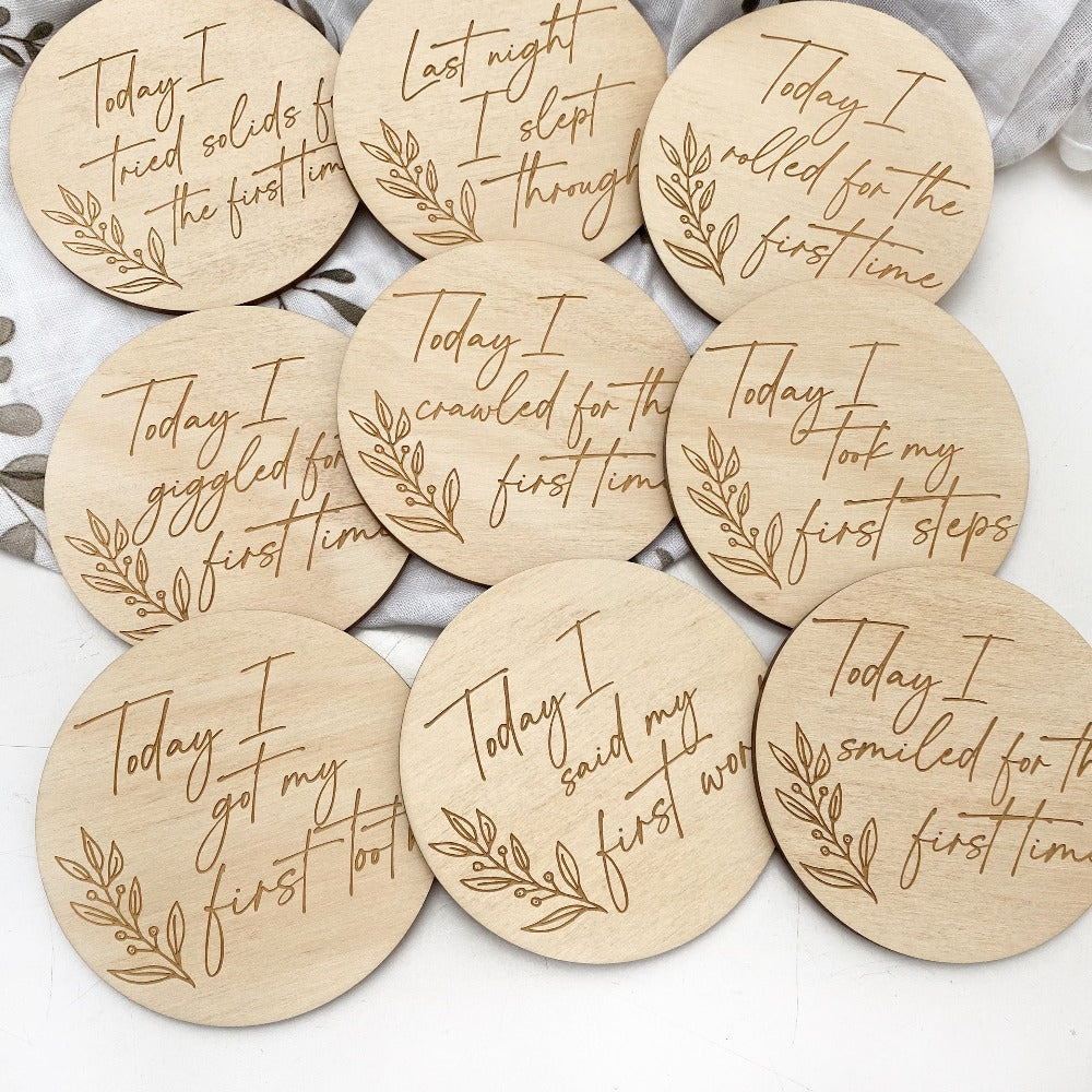 Developmental Milestones (9 plaques) - includes first tooth, first word, smiled, first steps, rolled over, slept through, crawled, giggled and tried solids. Perfect to personalise and record each special date on the reverse.