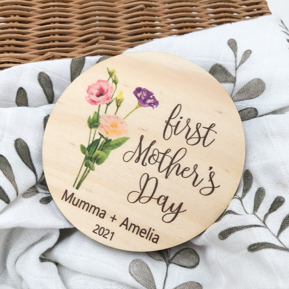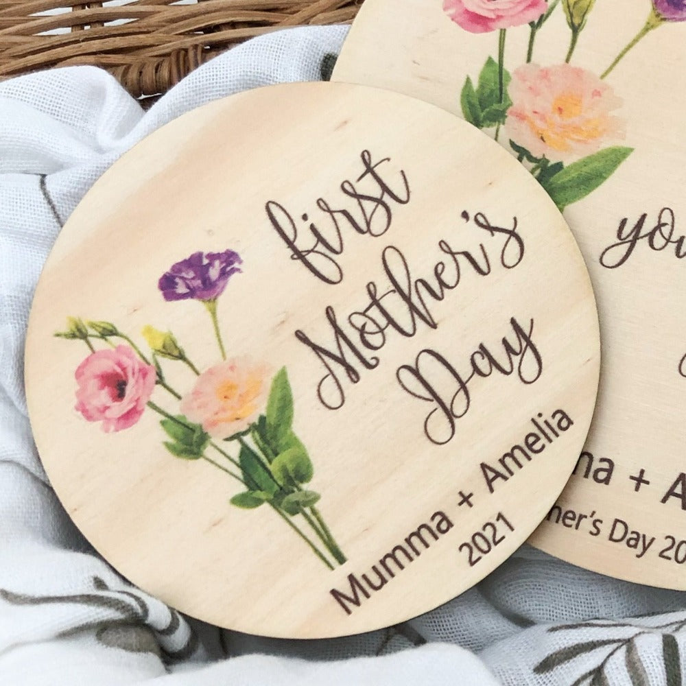 Capture your baby's first Mother's Day in a special way with our Personalised First Mother's Day Milestone Plaques. Made of timber and printed with a beautiful floral design, these plaques can be customized with your baby's name and a unique date stamp. Perfect for photos and to cherish for years to come.