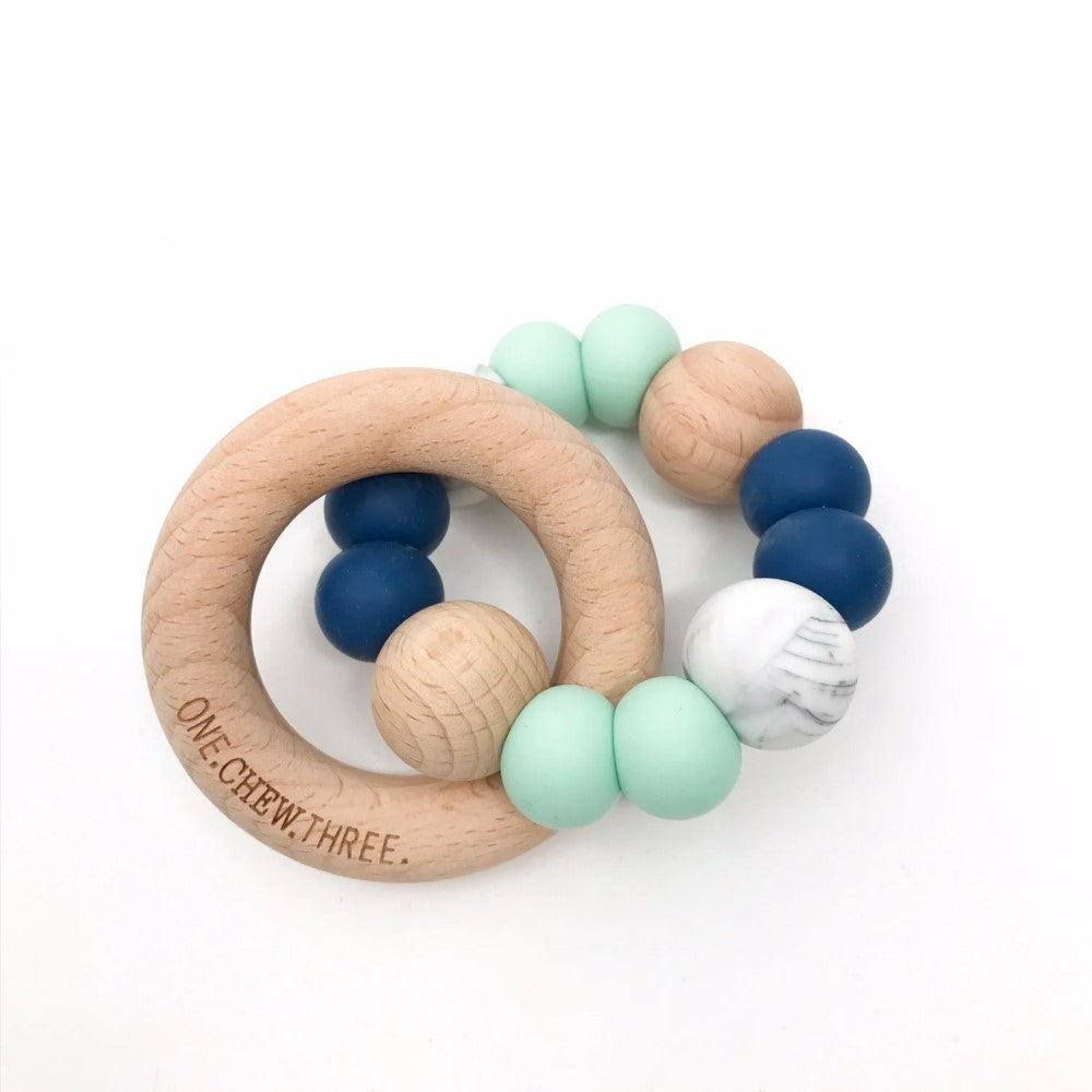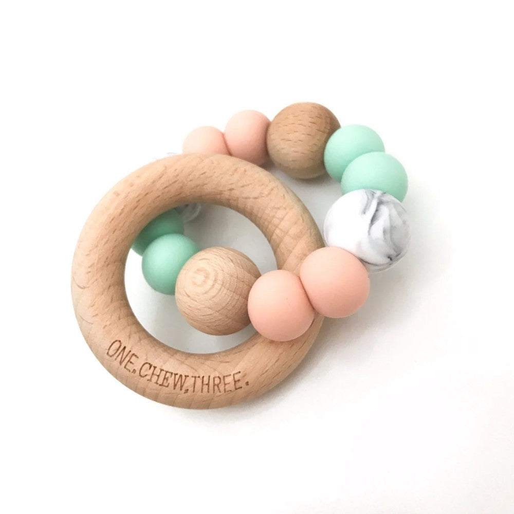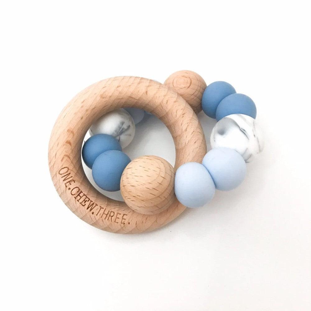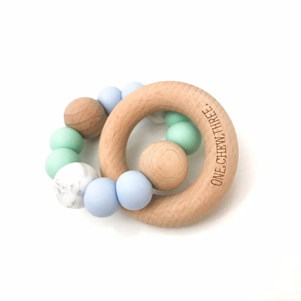 Introducing the Marble Accent Silicone and Wood Single Rattle, the ultimate modern teether. With dual color combinations and marble accents, this teether is perfect for soothing and massaging sore gums. Featuring a soft, chewable silicone ring and a hard, natural beech wood ring, it's a combination of our popular DUO and RATTLE styles.