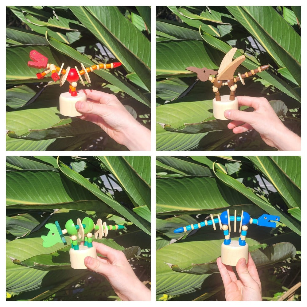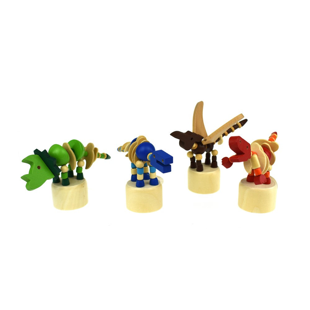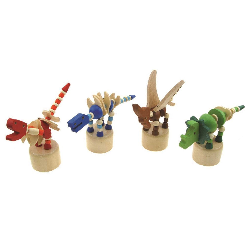 Transform playtime into a prehistoric adventure with our Playful Prehistoric Pal Wooden Dancing Dinosaur! Made with beechwood and non-toxic paint, these dinosaurs offer finger exercises, fidgeting and coordination benefits. Simply press the wooden button on their base to make them dance or change positions.