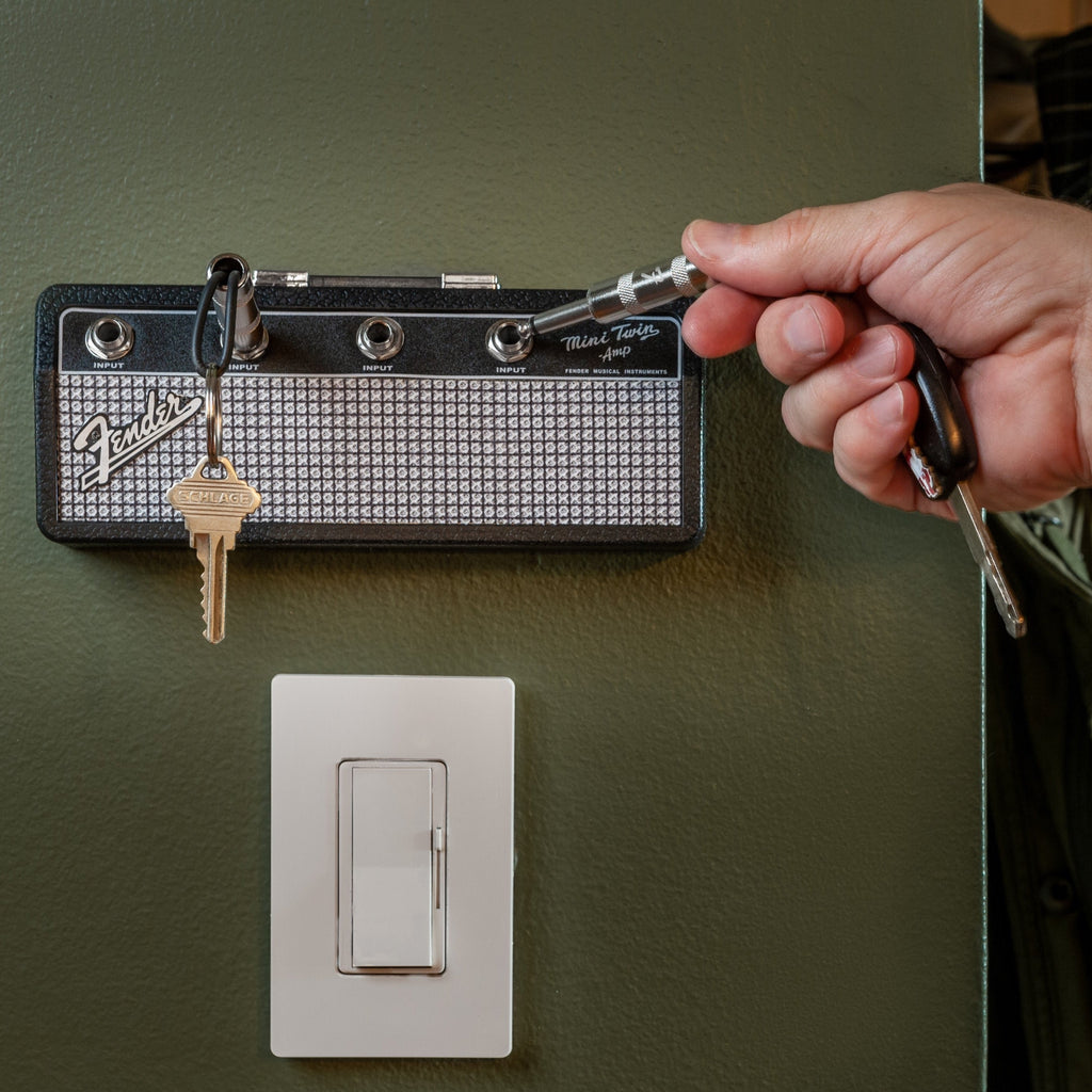 The officially licensed Fender Jack Rack comes with a sleek finish, comprising of real amp materials, 4 Fender guitar plug keychains, and 1 wall mounting kit with hardware to help you hang your keys like a rockstar!