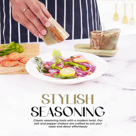 Enhance any dining experience with our Polished Stone Salt and Pepper set in a sleek green color. The polished stones provide a unique and elegant touch, while the tray offers convenience and organization. Add a touch of sophistication to your table with this must-have set.