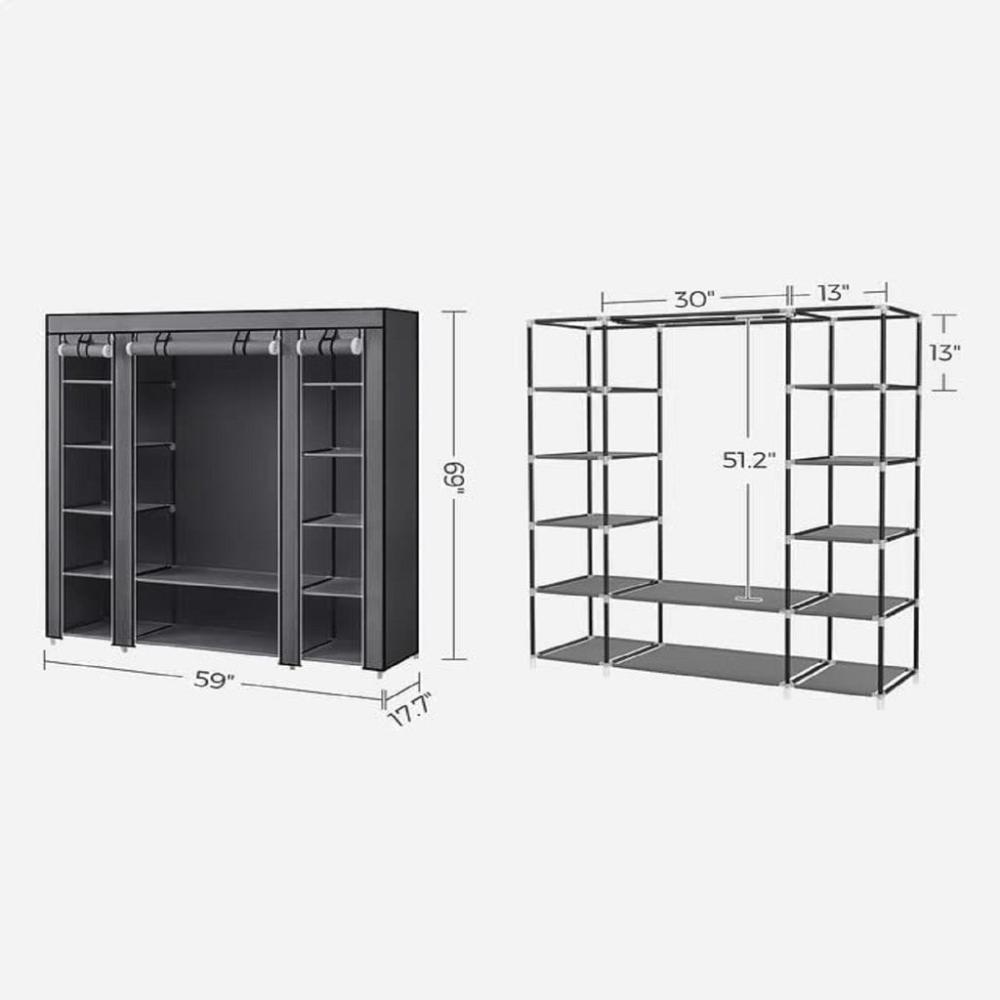 - Oodles of Space: Great size of 17.7”D x 59.1”W x 68.9”H with 1 movable clothes hanging rod and 12 storage shelves offers you extra spaces for your coats, dresses, bed linens, kids toys, folded clothes, and more
