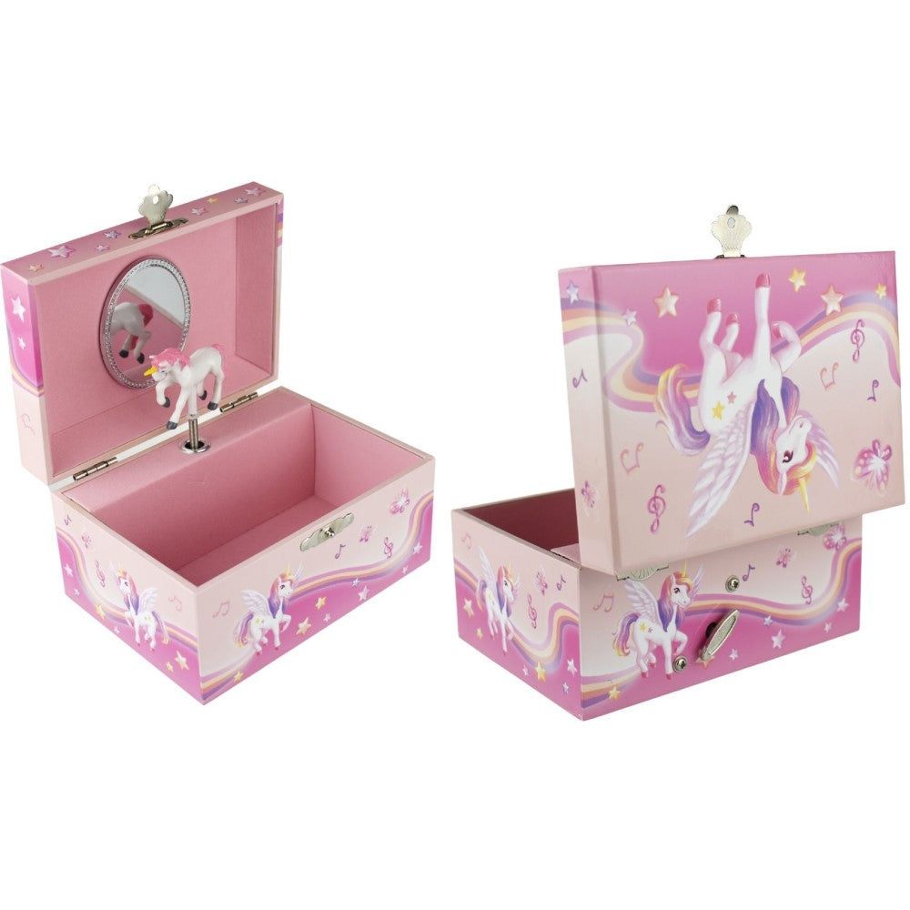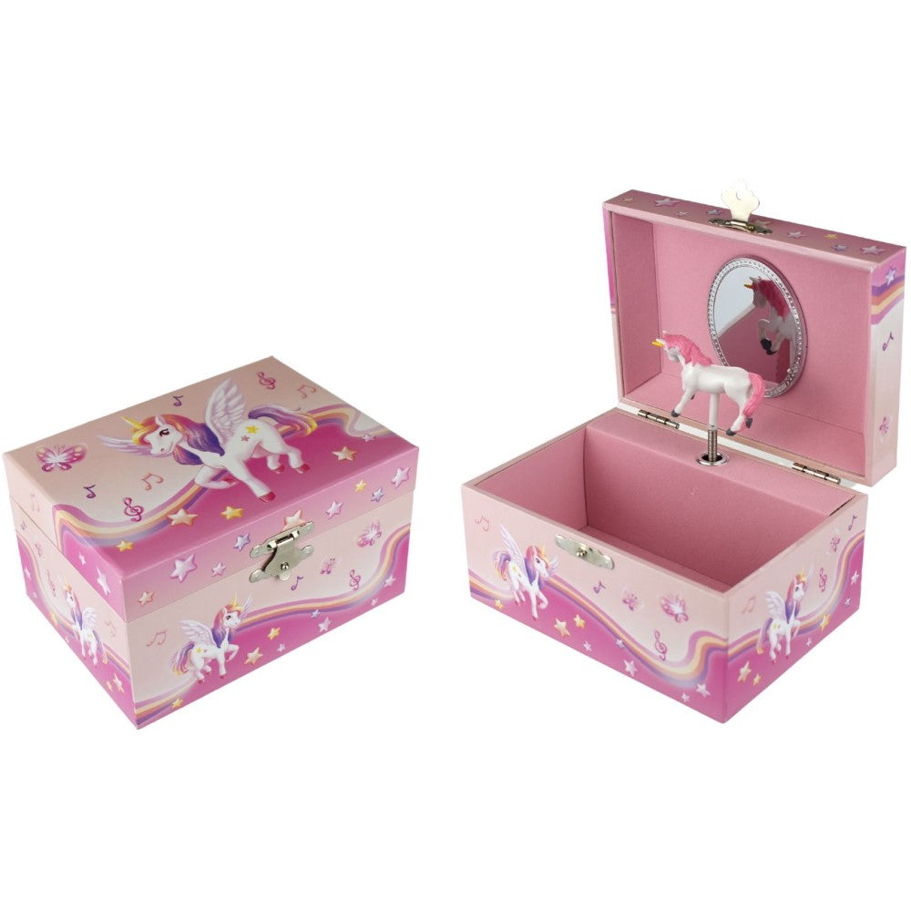 Experience the magic of unicorns with our Rainbow Unicorn Kids Keepsake Music Box. Covered in beautiful unicorn illustrations, this box features a wound-up music mechanism that plays when the lid is opened. The figurine spins along to the tune of SCHUBERT SERENADE, while the soft velvet interior and mirror add a touch of elegance. Keep your child's treasures safe in this enchanting box.