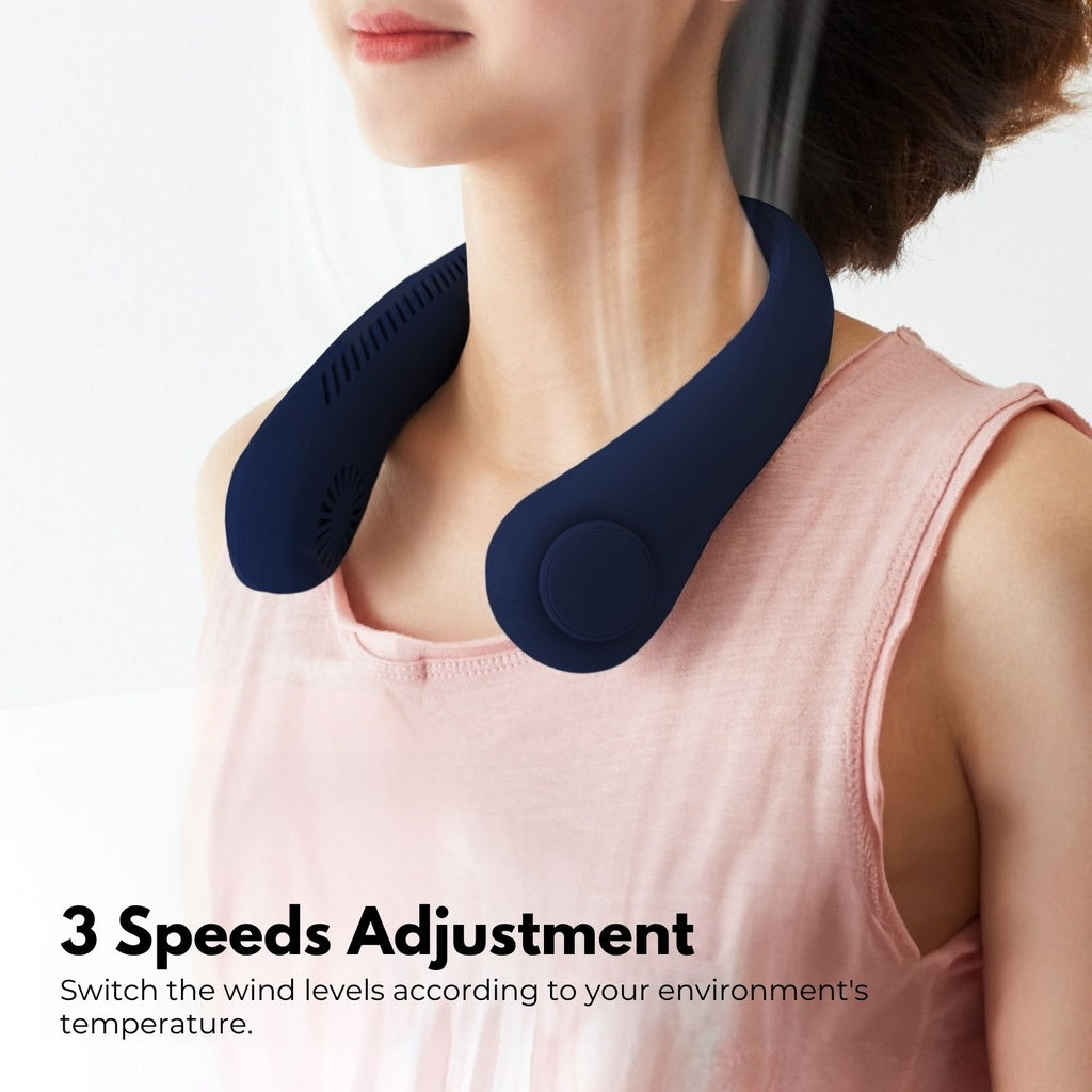 The Portable Neck Fan is a stylish and convenient personal cooling device designed for hands-free use. This rechargeable neck fan, available in an attractive blue color, hangs comfortably around your neck, providing a refreshing breeze wherever you go.