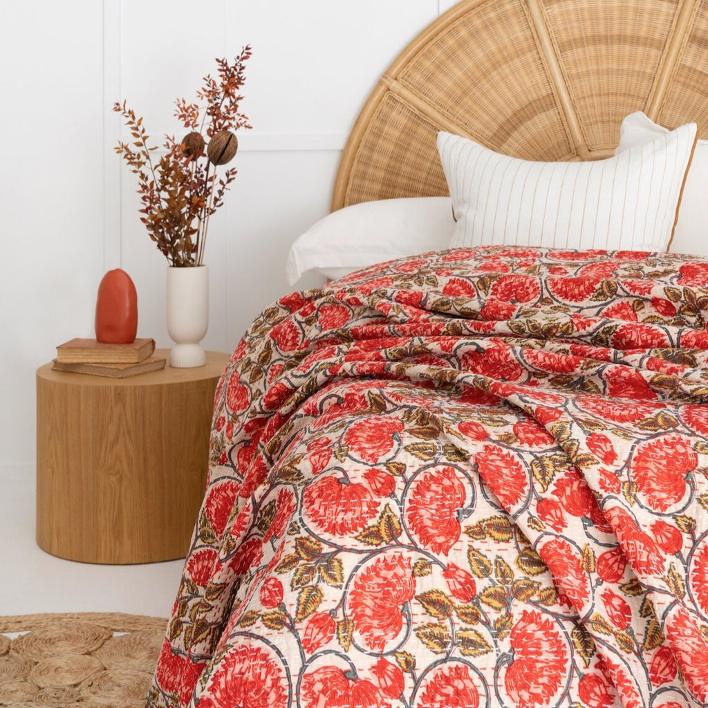 Our bold, beautiful Red floral Designed Hand Stitched Cotton Doona will take your bedroom décor to the next level. Crafted with 100% Cotton, this vibrant bedspread features a floral pattern that will bring a risk-taking flair to your room's design. Dive into the adventure of creating your dream bedroom!