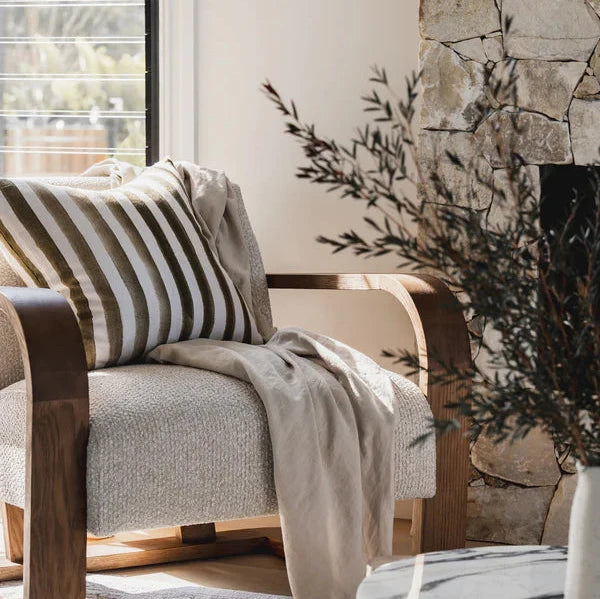Elevate your home decor with the Rumi Striped Khaki Green Linen Cushion Cover. Crafted with high-quality linen, this 50X50cms cover adds a touch of sophistication to any room. With its stylish striped design, this cushion cover effortlessly combines style and function. Elevate your living space with this elegant addition.