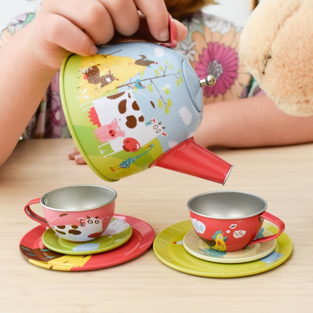 This Rustic Farm Tin Tea Set offers a charming 15-piece collection for playtime. Made with durable tin material, this set replicates a real farmhouse tea experience. Perfect for imaginative play, it encourages social skills and creativity. Let your child's tea parties be memorable with this delightful set.
