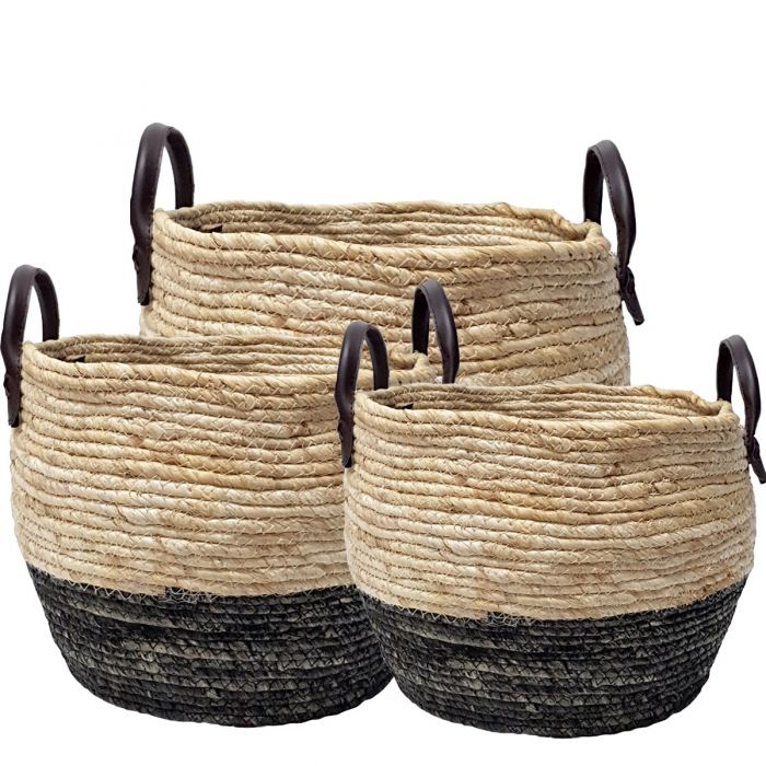 This set of three storage hampers with handles, available in natural and black colors, offers a stylish and convenient way to declutter your home. Made with high-quality materials, these hampers are durable and versatile for storing various items. Keep your space organized with this must-have storage set.