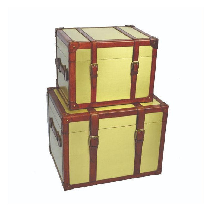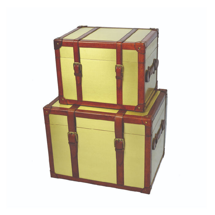 Take on your next adventure with this set of two metal trunk boxes. Crafted of durable metal encircled with leather strips and revitted with nails, these strong storage boxes will protect your belongings in style. Long leather strips and lockable metal buckles add an extra measure of security, while leather handles on each side make transport easy. Go boldly and conquer your next journey!
