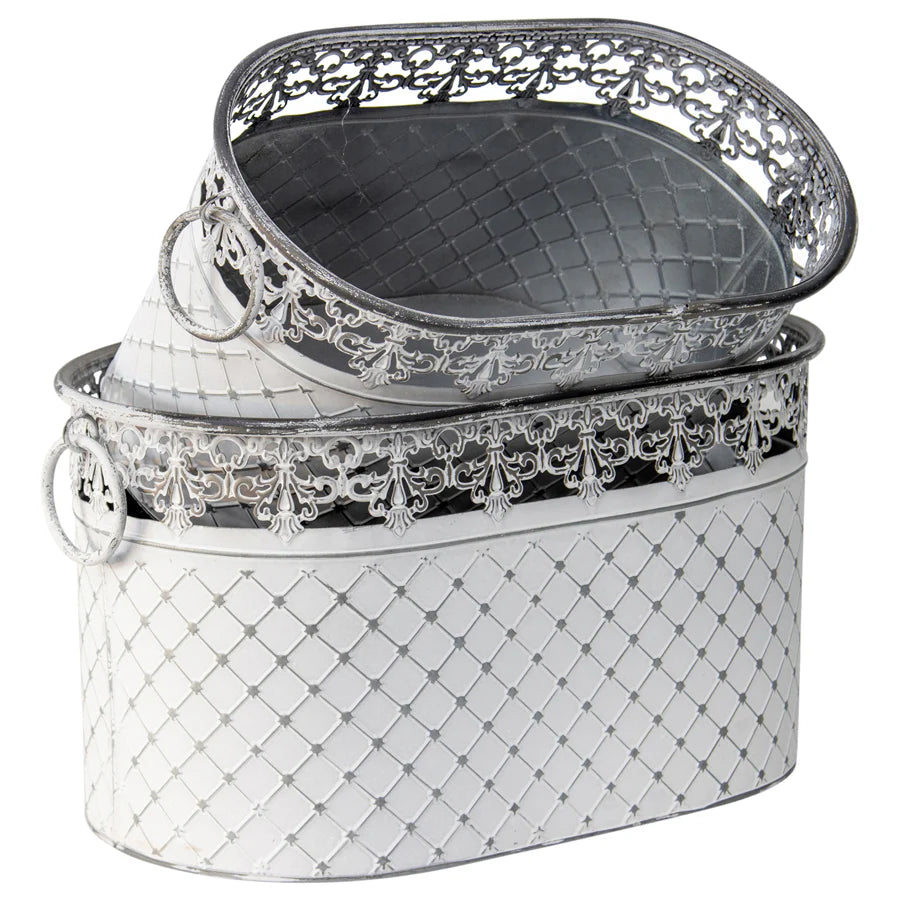 Enhance your garden with this Set of 2 Nested French Country Oval Pot planter. Made from durable materials, these planters will add a touch of elegance to any outdoor space. Their exquisite design allows for easy nesting and storage, making them a practical and stylish choice for your gardening needs.