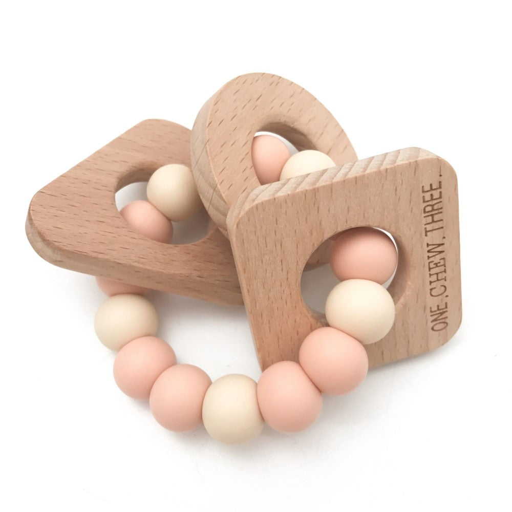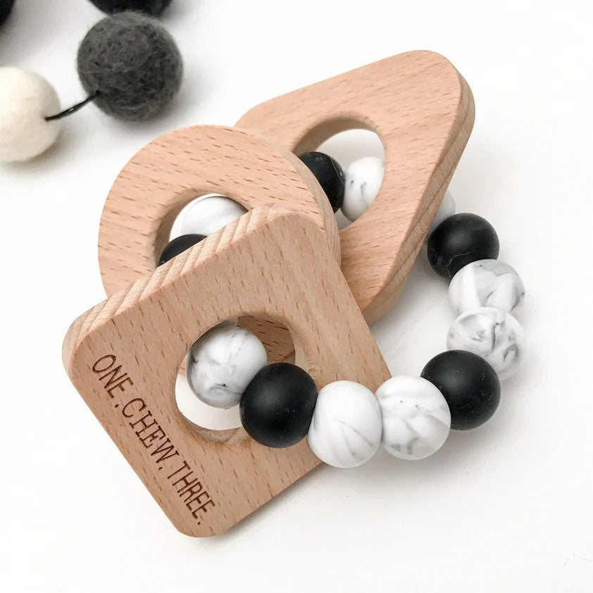 Our SHAPES teether offers both sensory play and teething relief for your little one. Made with naturally antibacterial beechwood shapes, including triangle, square, and circle, securely attached to a non-toxic silicone teething ring. Stimulate early learning and provide long-lasting comfort for your baby with this versatile teether, available in 6 vibrant colors.