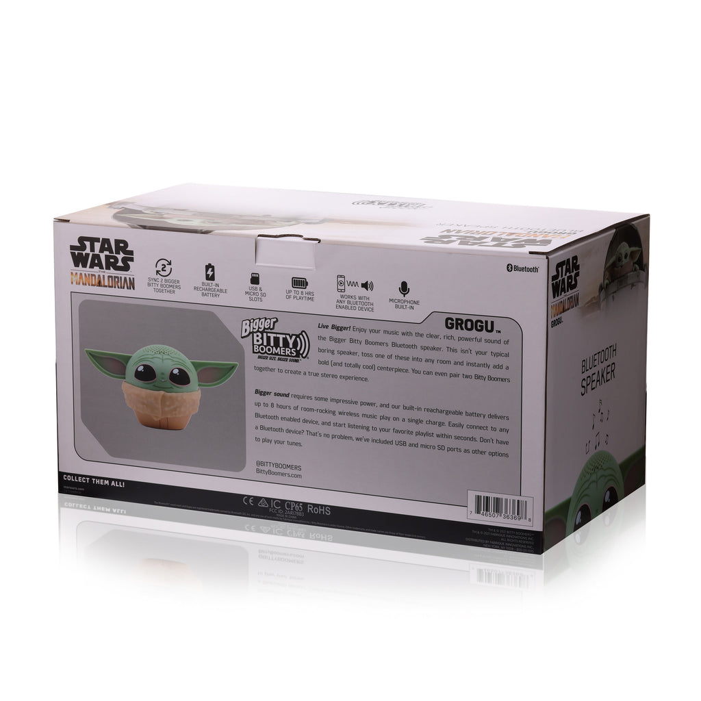 Star Wars: The Mandalorian Bigger Bitty Boomers Grogu 8" Bluetooth Speaker Live Bigger! Enjoy your music with the clear, rich, powerful sound of the Bigger Bitty Boomers Bluetooth speaker. This isn’t your typical boring speaker, toss one of these into any room and instantly add a bold (and totally cool) centrepiece. You can even pair two Bigger Bitty Boomers together to create a true stereo experience. Bigger sound requires some impressive power, and our built-in rechargeable battery delivers up to 8 hours of room-rocking wireless music play on a single charge. Easily connect to any Bluetooth-enabled device and start listening to your favourite playlist within seconds. Don’t have a Bluetooth device? That’s no problem, we’ve included USB and micro-SD ports as other options to play your tunes.