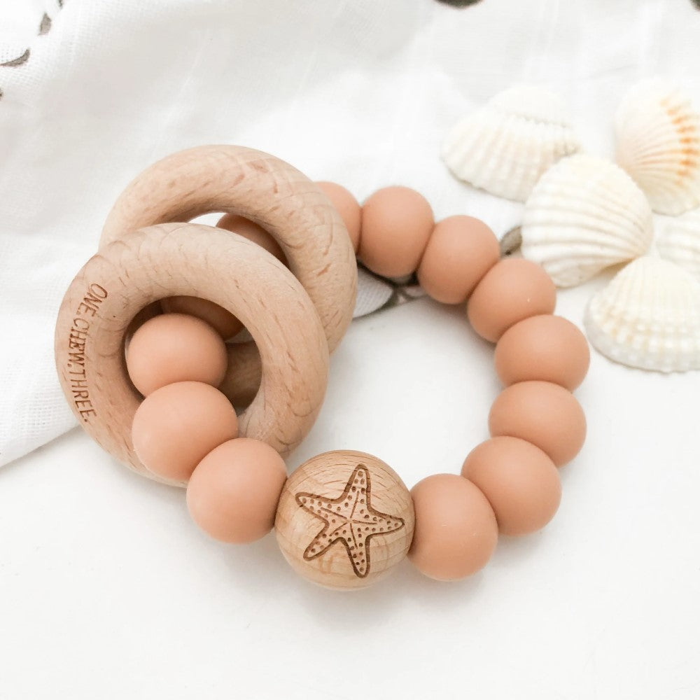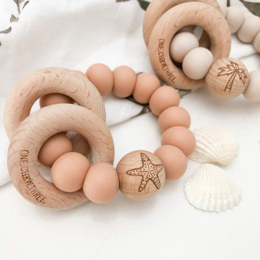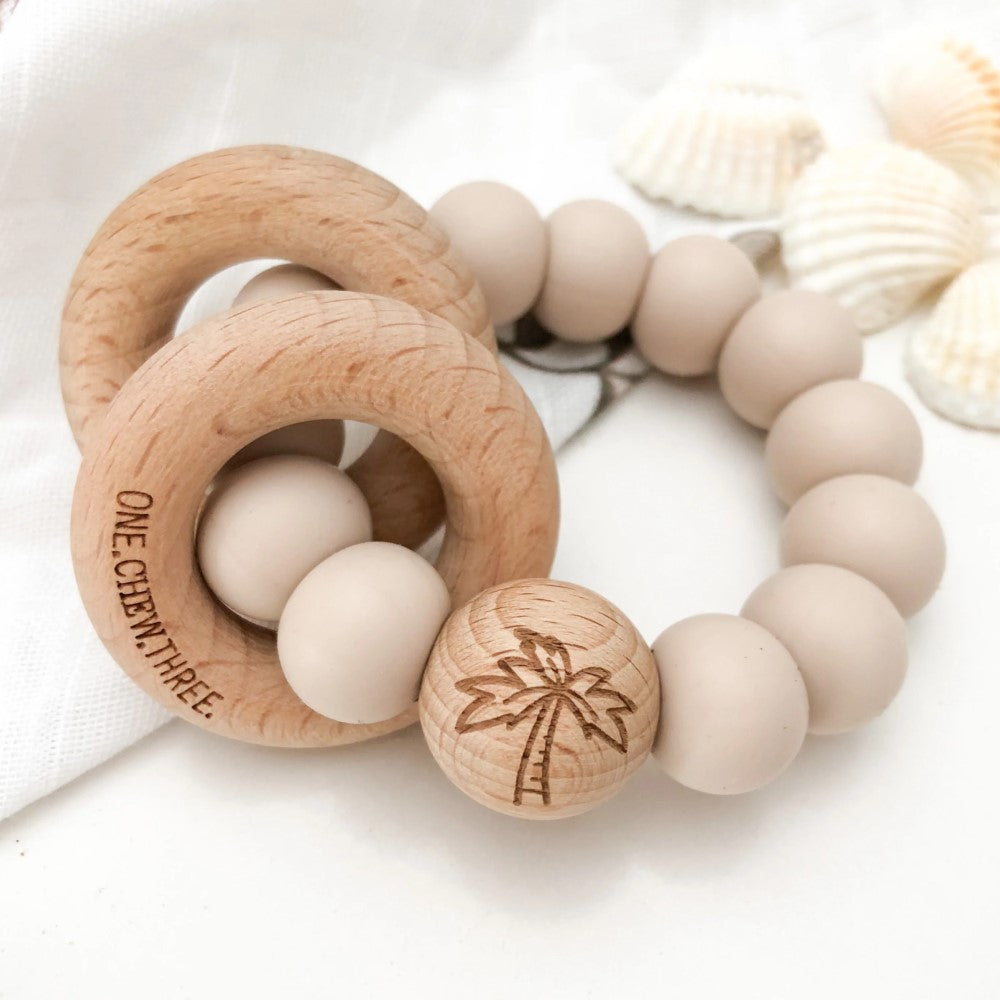 Elevate your little one's teething experience with our SUMMER Rattle Teethers. Featuring a stylish combination of silicone and wood, they are perfect for relieving sore gums. Available in two colors, sand and summer melon, with cute engraved summer elements. Perfectly pairs with our silicone catch bibs or stunning on its own.
