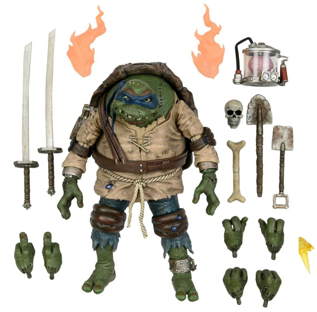 Channel your inner ninja with TMNT Leonardo Hunchback & Ultimate Universal Monster 7" Action Figurine. This highly poseable figure features a massive shell for storing accessories, including a brain in a jar, katana weapons, and more. With interchangeable hands and flame accessories, you can create the perfect ninja display.