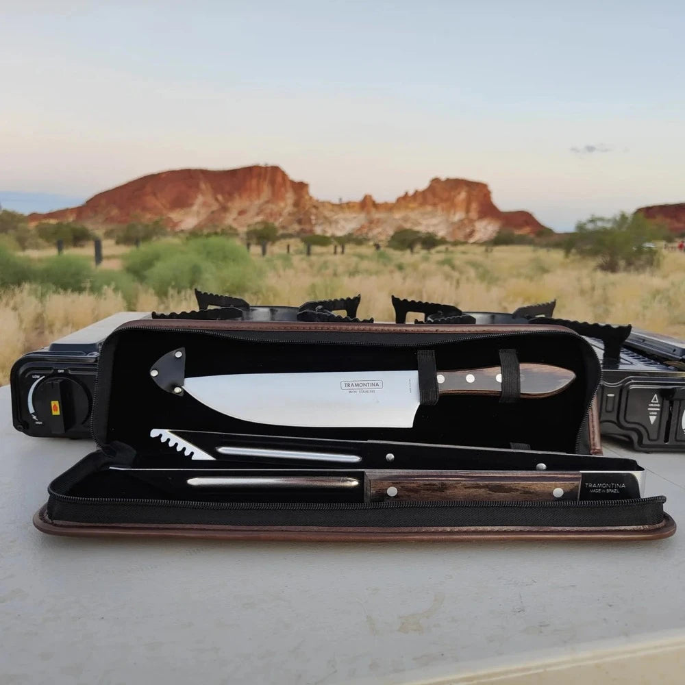 Introducing the Tramontina Churrasco Carving Set with Leather Pouch. This versatile set comes with four essential pieces, including a carving knife, carving fork, sharpening steel, and a beautiful leather pouch for storage. Crafted with precision and durability, this set is perfect for carving and serving your favorite meats.