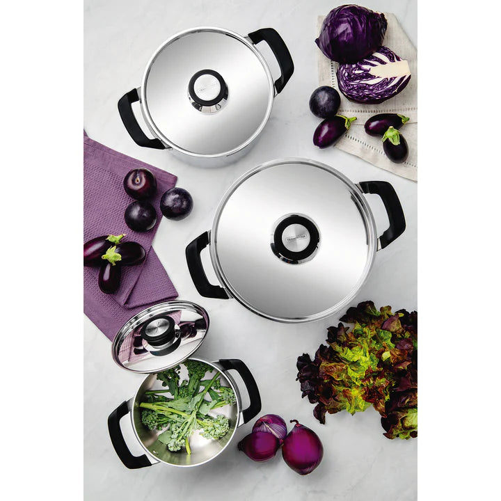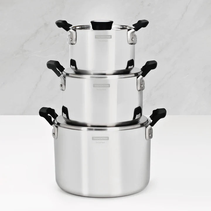 Upgrade your kitchen with the Tramontina Grano Compact 3Pcs Stainless Steel Cookware Set. With a contemporary design and tri-ply base technology, this set offers even heat distribution for faster, more uniform cooking. Made of durable stainless steel, it's also energy-efficient and versatile for use on various stovetops.
